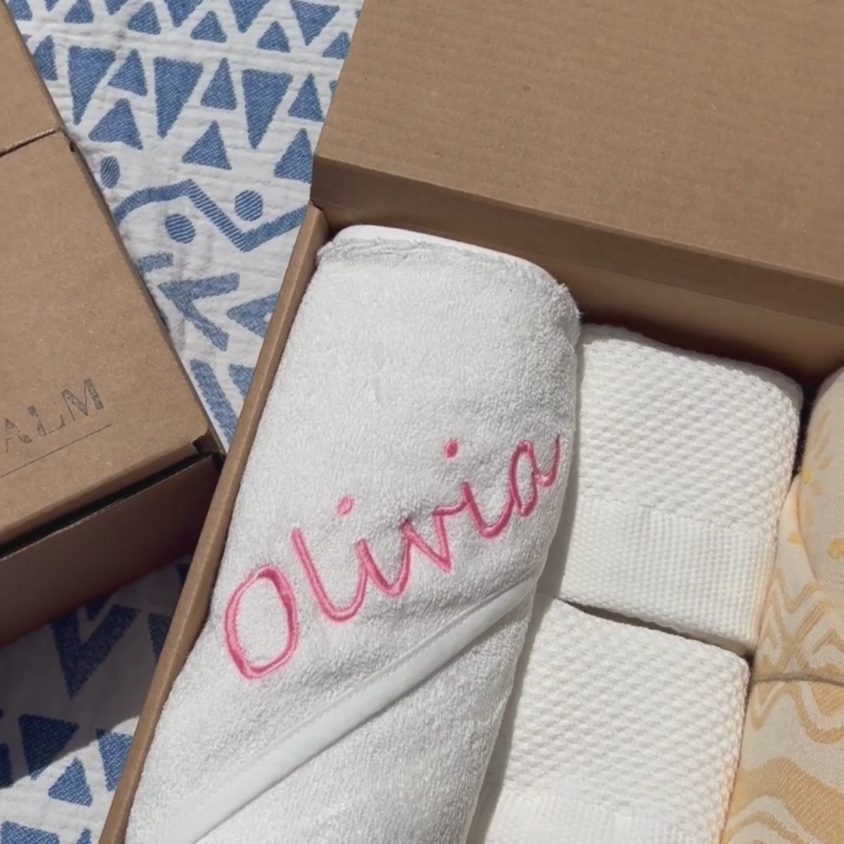 Each bundle includes our ultra-soft hooded baby towel, matching washcloths, and one of our bestselling peshtemal towels. The towels are packaged in a gift box and include a blank card for your personal message.